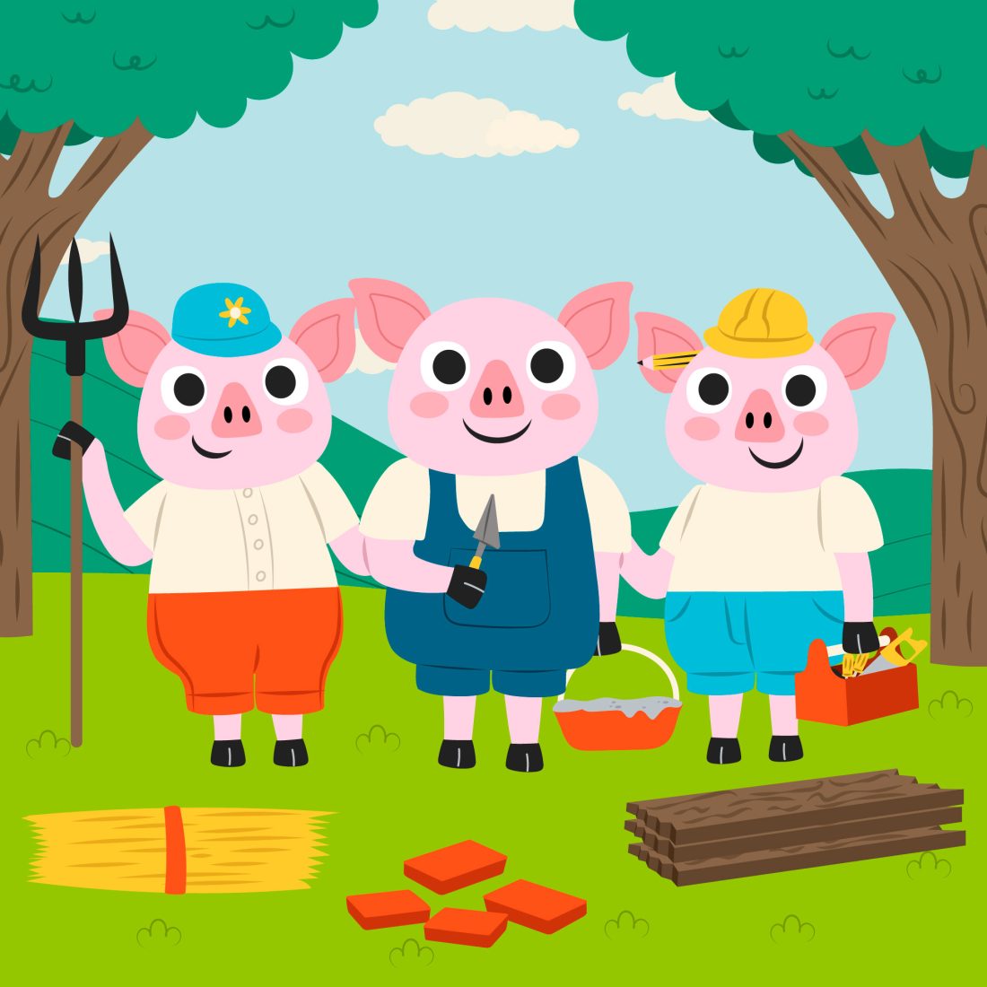 Series of five vector illustrations designed for Freepik, based on the classic tale The Three Little Pigs, reinterpreted with a fresh and contemporary style. Each piece depicts key moments of the story through expressive characters, dynamic compositions, and a vibrant color palette that creates a