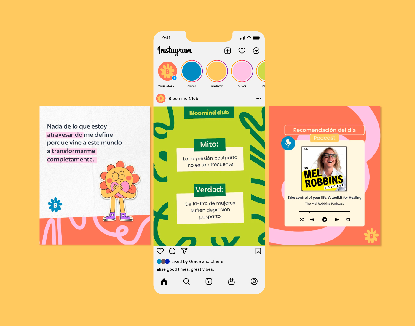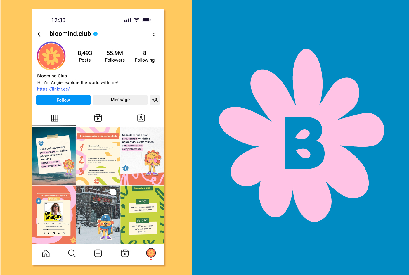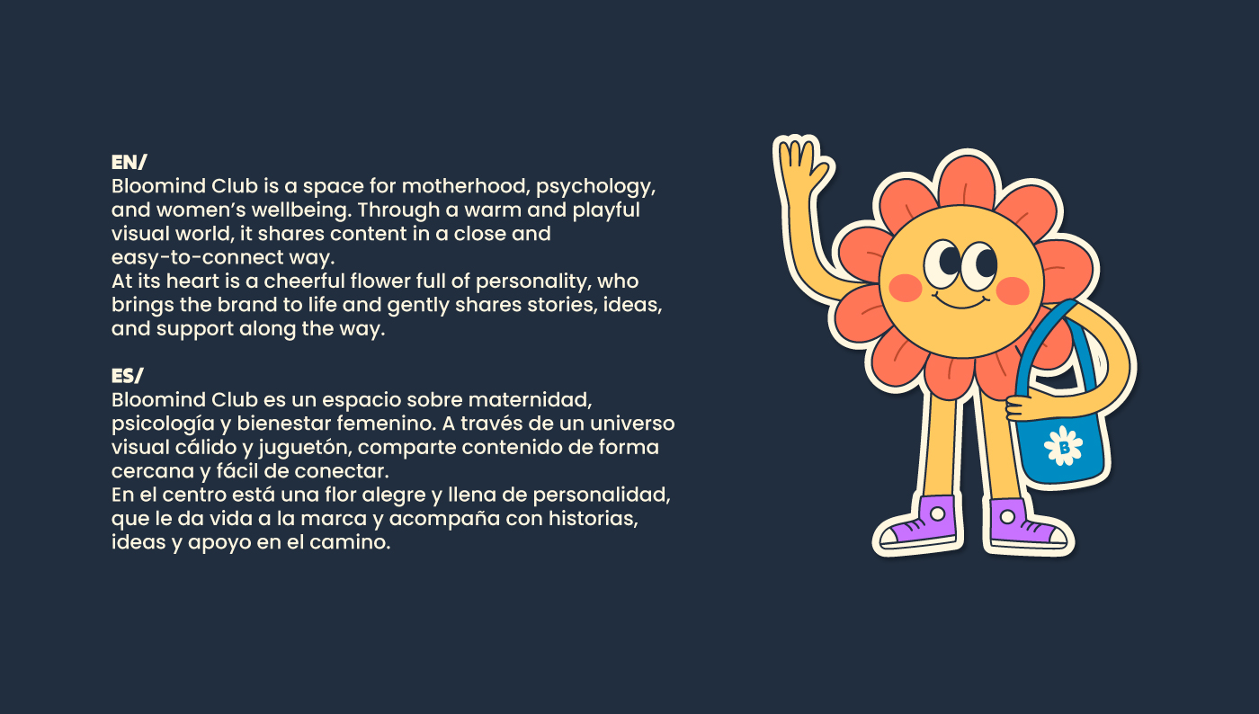 Bloomind Club is a space for motherhood, psychology, and women’s wellbeing. Through a warm and playful visual world, it shares content in a close and easy-to-connect way.