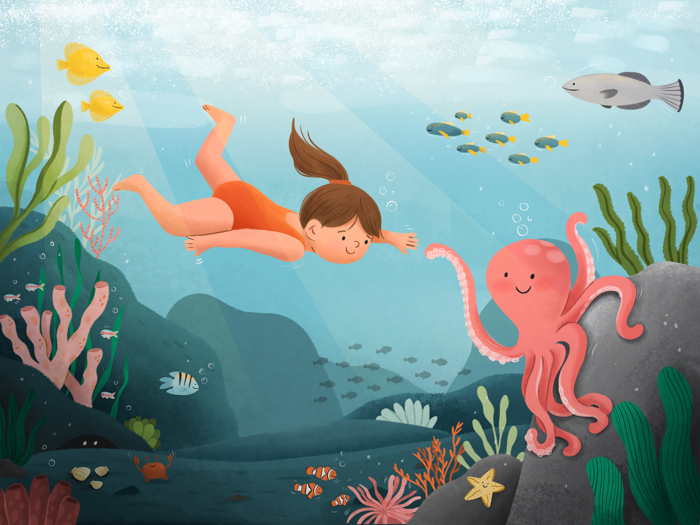 Ilustración narrativa de una niña nadando bajo el mar mientras se acerca con curiosidad a un pulpo que extiende uno de sus tentáculos. La escena transmite asombro, conexión con la naturaleza y sensibilidad emocional, utilizando una paleta suave y personajes expresivos. Pensada para libros ilustrados y proyectos editoriales infantiles.