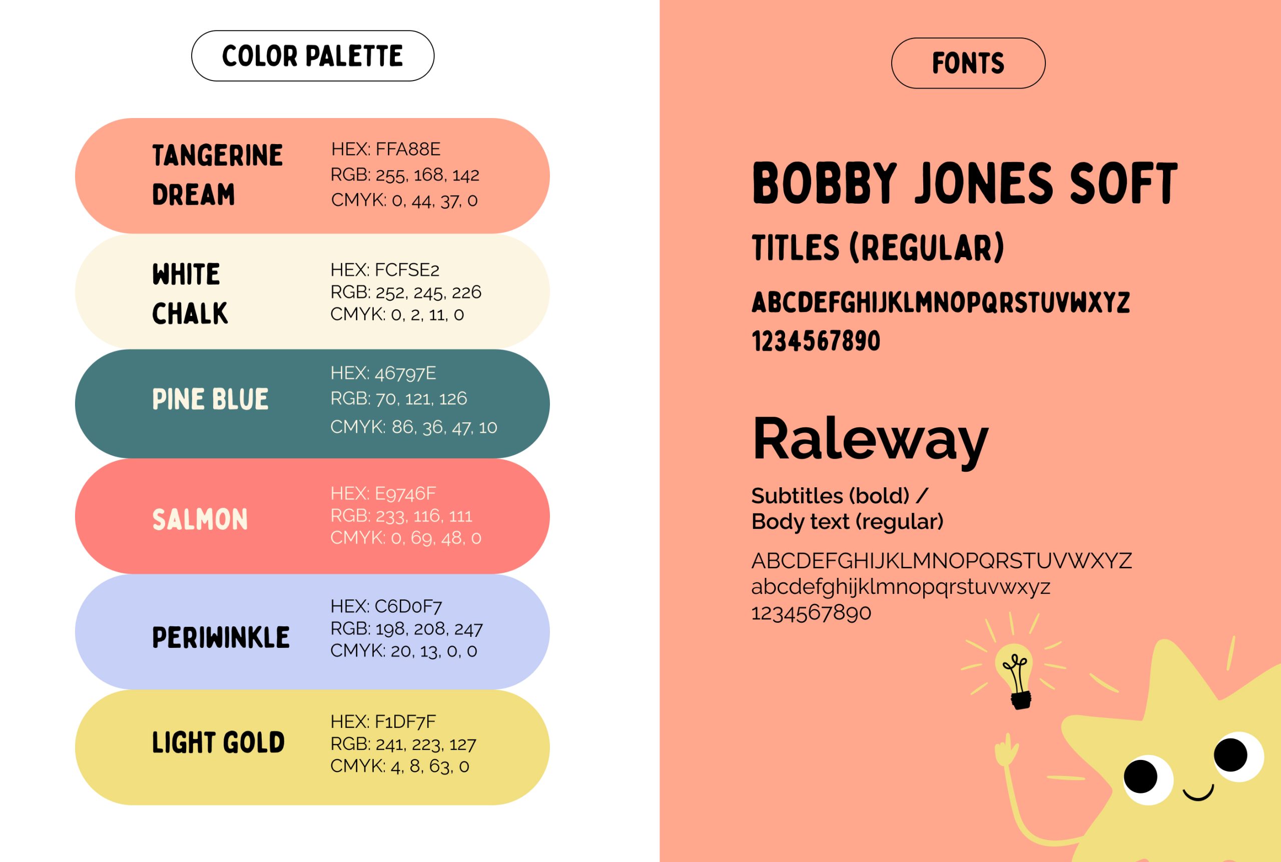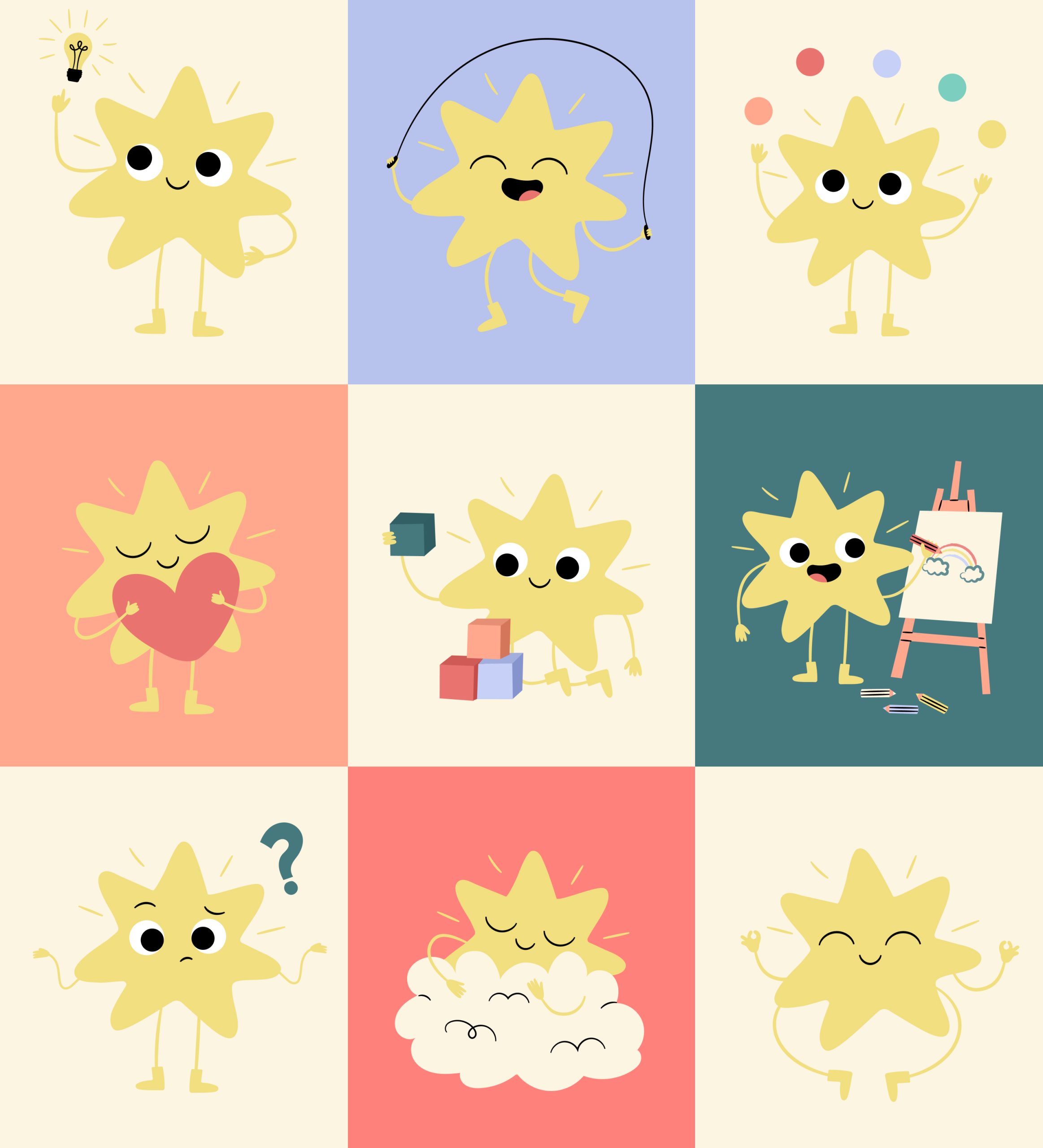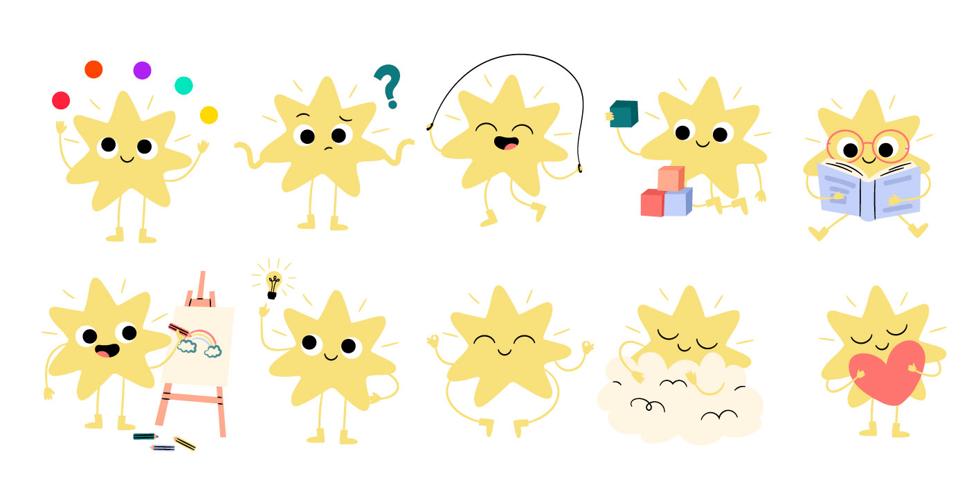 El proyecto incluye el diseño del personaje principal, una estrella amigable que acompaña a los niños durante las actividades y simboliza el descubrimiento y la curiosidad. La identidad se completa con un logotipo que incorpora destellos gráficos, una paleta de colores vibrantes y tipografías legibles, pensadas para su aplicación en distintos materiales educativos y de juego.