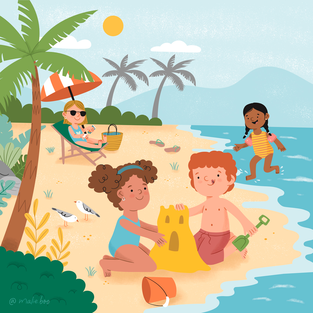 Ilustración infantil creada en Procreate que retrata una escena de verano en la playa. La composición muestra a niños realizando distintas actividades playeras, explorando el entorno y compartiendo el espacio de forma espontánea. El enfoque está en el uso del color, las formas simples y la narrativa visual, pensada para proyectos editoriales infantiles.
